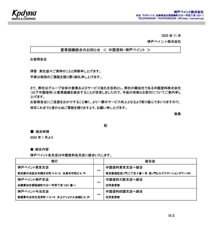 中国塗料と営業統合しました